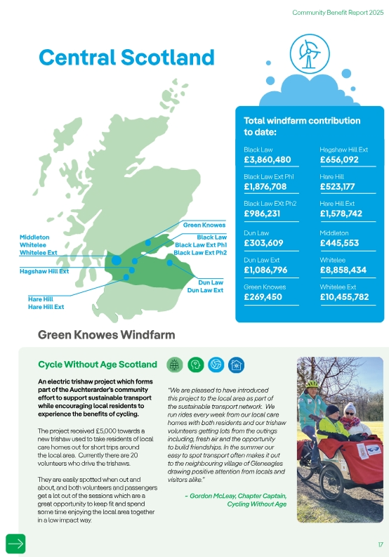 The fantastic work of our CWAS (Cycling Without Age Scotland) Auchterarder Chapter a.k.a. our trishaw project features in the ScottishPower Renewables 2025 Community Benefit Report.