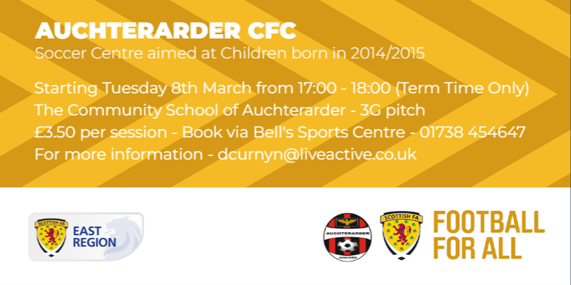 New Football Sessions Available Locally Auchterarder CFC are offering two new football programmes, both of which kick-off (see what we’ve done, there!!!) in early March. #BeActiveBeInvolved Tim HartMarch 1, 2022 Facebook0 Twitter LinkedIn0 Reddit Tumblr Pinterest0 0 Likes