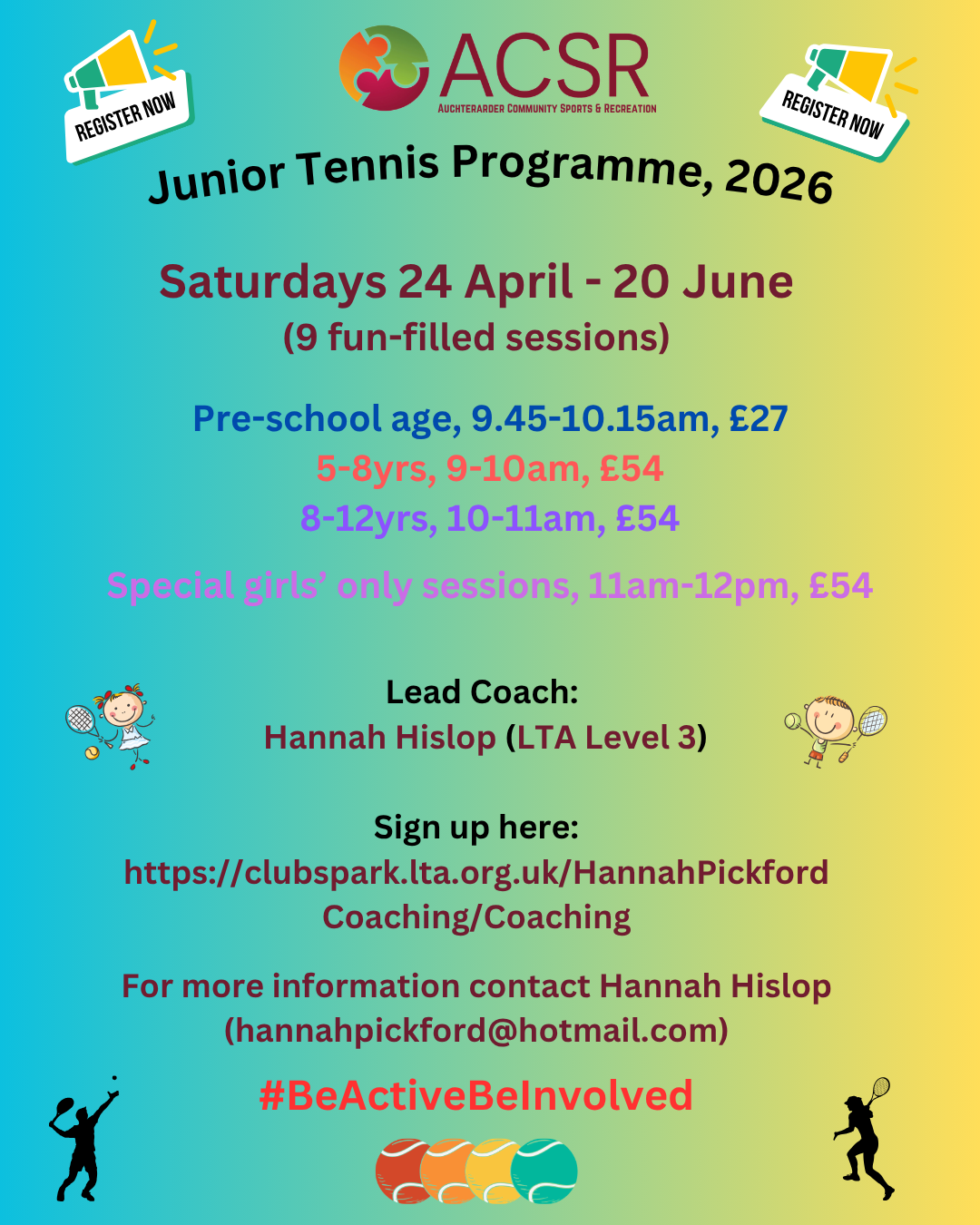 The sessions continue to be led by our brilliant Head Coach Hannah - and the 9-week block begins this Saturday (24 June 2026). You can #BeActiveBeInvolved by signing up here: Clubspark / Hannah Hislop Coaching / Coaching.